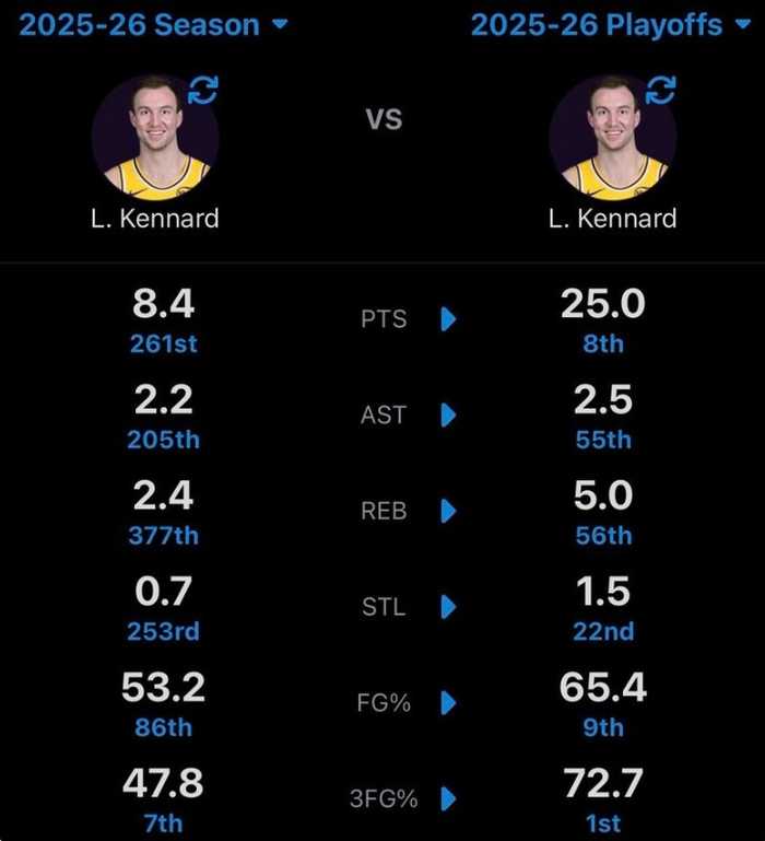 肯纳德本赛季常规赛场均8.4分2.3板2.2助 季后赛场均25分5板2.5助 发布时间:22/04/2026, 15:41:18 4月22日讯 NBA季后赛西部首轮G2,湖人101-94战胜火箭。 此役,肯纳德首发出战42分钟,投篮13中8,三分球6中3,罚球4中4,拿到23分6篮板2助攻3抢断。 在过去两战,肯纳德场均出战40.1分钟,砍下25分5篮板2.5助攻1.5抢断,投篮命中率65.4%,三分72.7%,罚球80%。 在常规赛中,肯纳德场均能得到8.4分2.3篮板2.2助攻。 标签: 雨燕直播网
